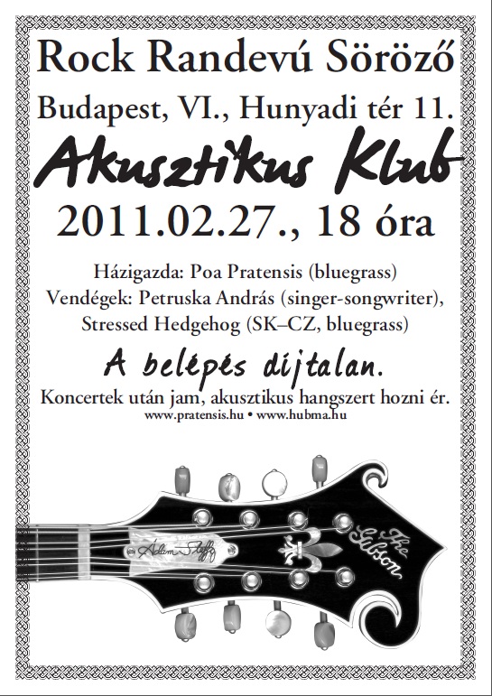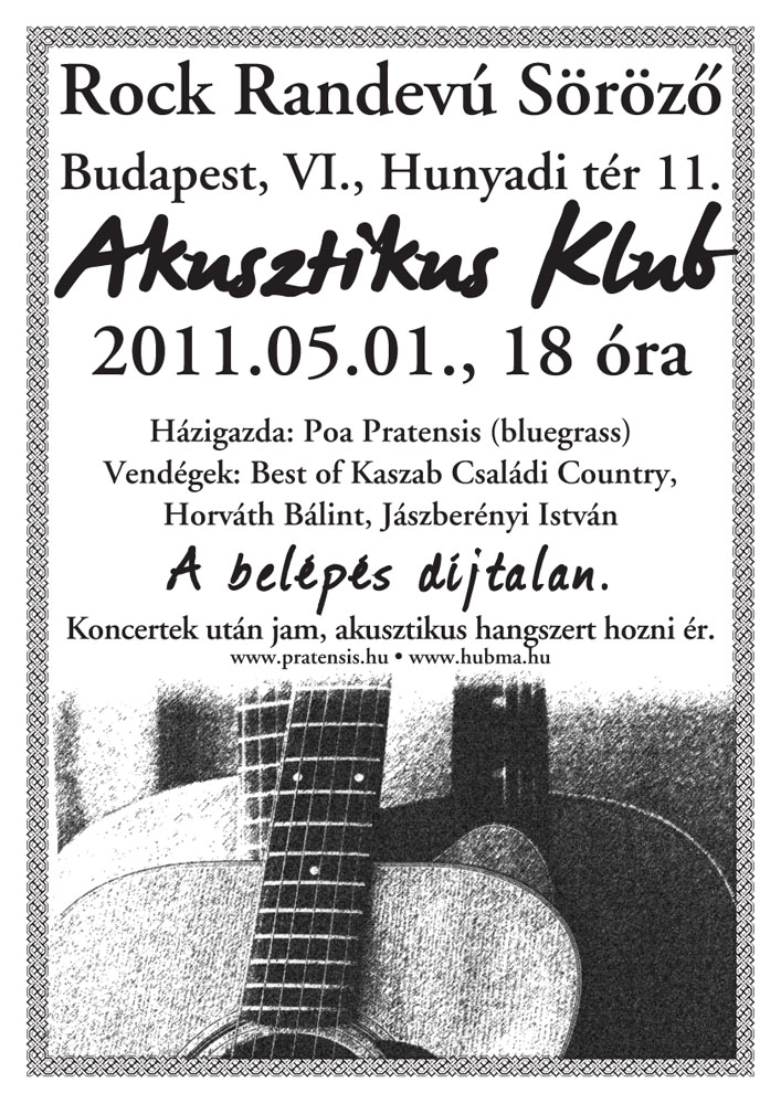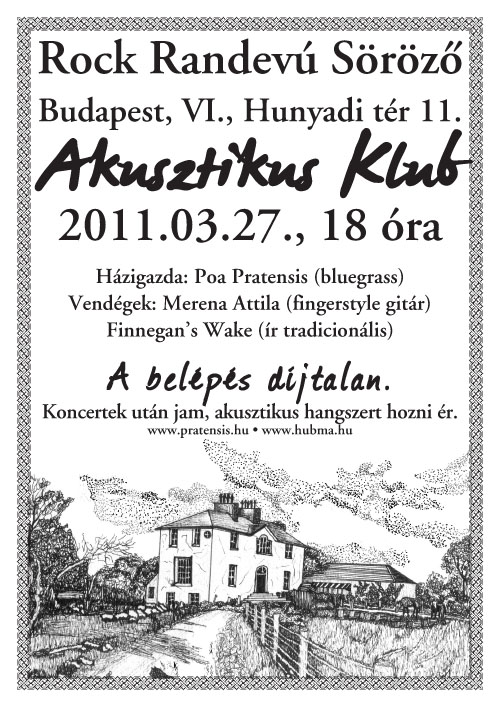 Április 20-án szokás szerint várjuk a tisztelt nagyérdeműt a Bonyai étterembe, ahol bluegrass fog szólni orrvérzésig (verekedés esetén).